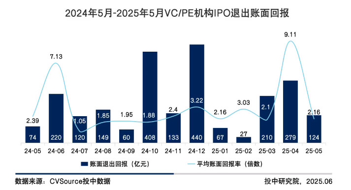 具体来看,共11家具有VC/PE背景的中企实现上市,获得VC/PE机构支持的上市企业数量同比上涨57.14%,环比下降8.33%。5月VC/PE机构IPO账面退出回报规模为124亿元,同比上涨67.57%,环比下降55.56%;平均账面回报率为2.16倍,同比下降9.62%,环比下降76.29%。